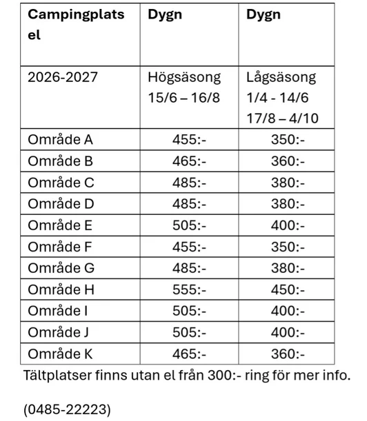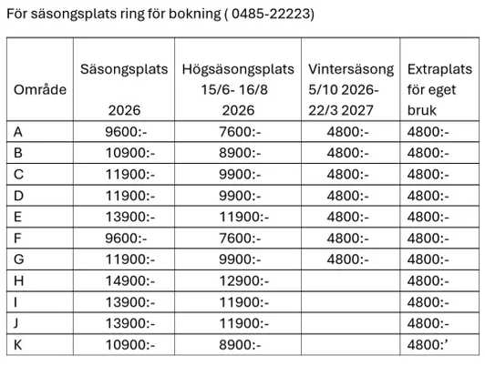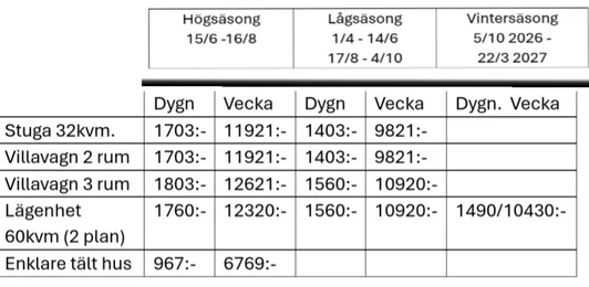 Våra priser varierar beroende på område och typ av plats. Vi erbjuder priser för både låg- och högsäsong. Vi är stolta över att erbjuda större platser till ett billigt pris. Nedan är en översikt över våra priser för olika områden. I Alla våra boenden ingår ETT bomkort och administrativa avgifter.